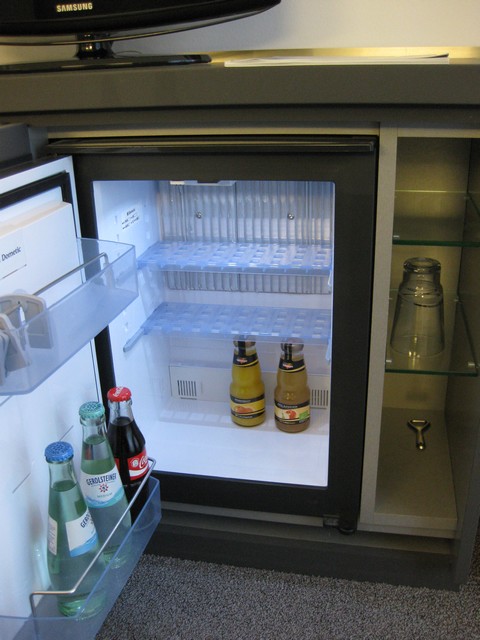 The desk was opposite the bed and large enough to use it for working though one had to rearrange a few things. Next to the desk or part of the desk was a small sideboard with the flat TV on it and the minibar in it. Three drawers were the only place in the room to store things. One drawer could be locked with a key. There was no safe in the room.