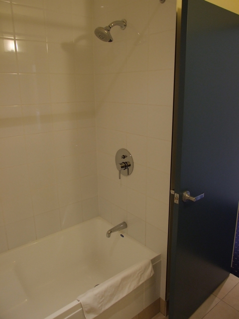 The room had two beds on the left side with a bedside table between and four reading lamps. There were also central switches for the main lights at the bed. The mattress was a bit too soft for my taste; it is probably the same sort of mattress than in the Ventura Inn in Hamilton. Opposite the bed were a table with two chairs and the working desk with LAN connection and TV on it. Although the TV took some space of the working desk, it was enough space to work on a laptop. At this hotel CNN was available. Plugs