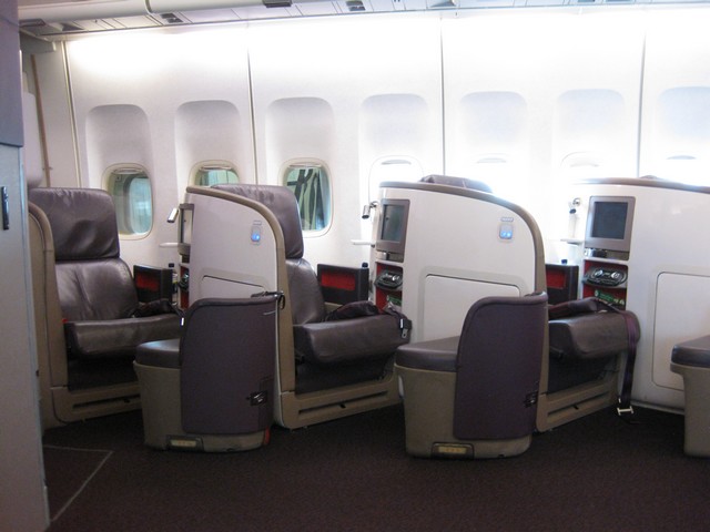 The 747-400 of Virgin is equipped with 44 flat-bed-seats in herringbone style. The front cabin in the nose of the 747-400 has only 14 seats at the windows, there are not seats in the middle of the cabin. The second part of the Upper Class Cabin is between the first door and the second door and configured 1 – 2 – 1. The Upper Class bar area is also located here. This makes the last two seats in the upper class the less desirable seats. There are also 10 Upper Class seats in the upper deck.