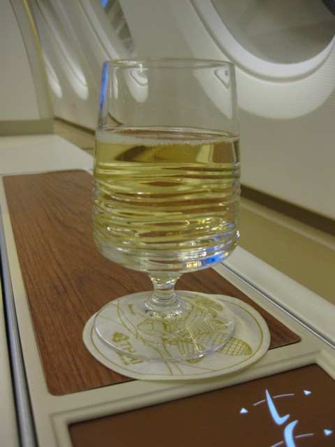 I was among the first passengers boarding the plane and the first one in the First Class cabin. I walked to my seat and a flight attendant approached me and asked what I like to have as pre departure drink. I asked for a glass of champagne. Before the agent with a glass and the bottle of Dom Perignon arrived, a hot towel was brought by another flight attendant.