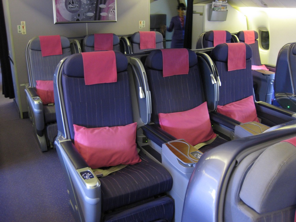 Our flight for today was a Boeing 777-3D7 with registration HS-TKC, named “Kwanmuang”. It was delivered to Thai Airways on November 18, 1999 as new plane and is configured with 34 seats in Business Class and 330 seats in Economy Class. It is powered by two Rolls Royce Trent 892 engines offering a thrust of 92000 lbf each.