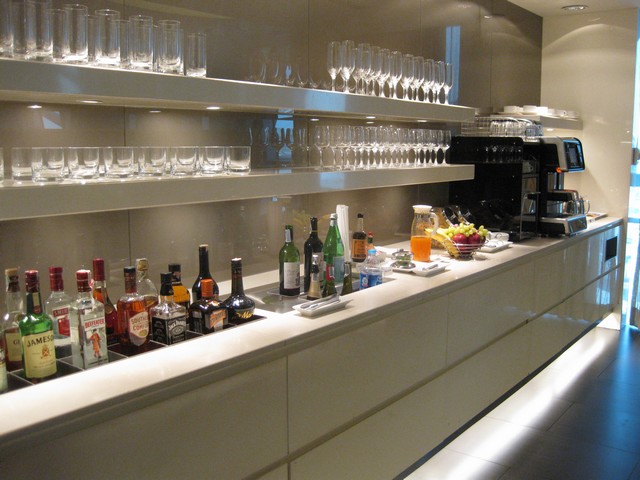 The lounge was not very busy and I had no difficulties to find a seat at a corner of the lounge right at the window overlooking the concourse. There lounge was divided in different areas which were separated by wooden walls and all areas were also on different levels. The buffet was one end of the lounge. There were cold and hot items on offer such as a soup (warm), salad items, sandwiches and wraps, fresh fruit and yoghurt among other things. There were different wines and as far as I remember even Champagne on offer in the lounge. The lounge also offered showers and toilets within the lounge and the international newspaper selection was also quite good and I used to opportunity to pick up the UK edition of the recent Business Traveller UK Magazine. After approximately 35 minutes I decided to leave the lounge, which now was much busier than at the time I entered it and I went to the Cathay Pacific Lounge next door.