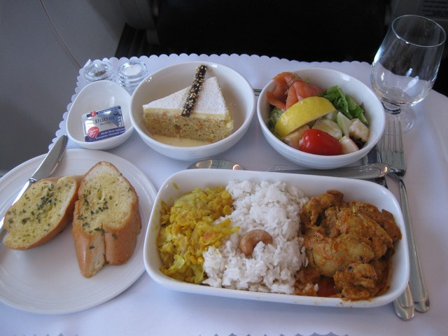 Due to higher load on this flight the service was done using the cart. Earlier the flight attendant had asked what we like to have as our meal of choice. Now the selected menu with all other plates arrived on the tray. The break basket was also offered and on offer were rolls, croissant and garlic bread and also pastries. I decided to have white wine with the meal, which was not immediately served, as the flight attendant had to go searching for a cork puller, which was not available in the Business Class but in the Economy Class Cabin. The glass of water was already pre-filled and placed on the tray.